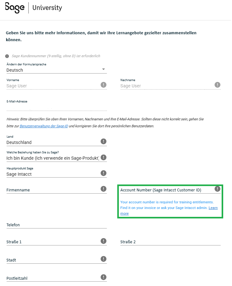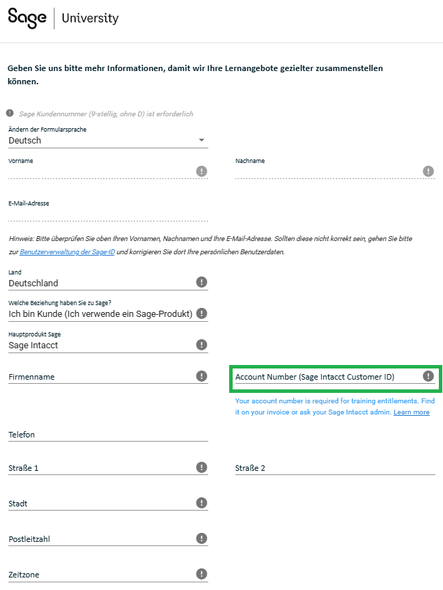 Bitte geben Sie Ihre Sage Intacct Kunden-ID in das Feld „Kundennummer“ ein, um Zugang zu den Schulungen und Vorteilen zu erhalten, die Ihrem Unternehmen zur Verfügung stehen.