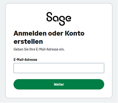 Loggen Sie sich mit Ihrer Sage ID (E-Mail-Adresse) ein oder erstellen Sie ein neues Konto. Für die Kontoerstellung benötigen Sie Zugriff auf Ihr E-Mail-Postfach, um einen Prüfcode abzurufen.
